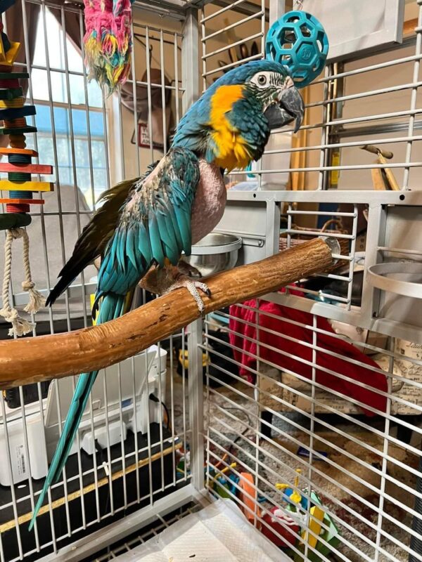 Andy is a blue throated macaw, vetted in great health. He’s a lil naked but that’s Andy. He has since being removed from his stressful environment has quit plucking and plucking as he was. I’m doubtful he will ever grow feathers as he was a plucker for too long before coming into rescue. He is 24 Andy a sweet boy. He is Leary but once he steps up is a sweet one. He doesn’t attack or bite to kill. He needs a very quiet home. Maybe with an older person. Preferably woman. He doesn’t speak but is very personable when spoken to. He likes his quiet naps and enjoys peace. He seems to like females. I would love to keep him, but there are so many I want to keep 😂😂. He blushes so easily. He’s a little bird as the blue throated are not known to be a large birds like a blue and gold. He will definitely win your heart.