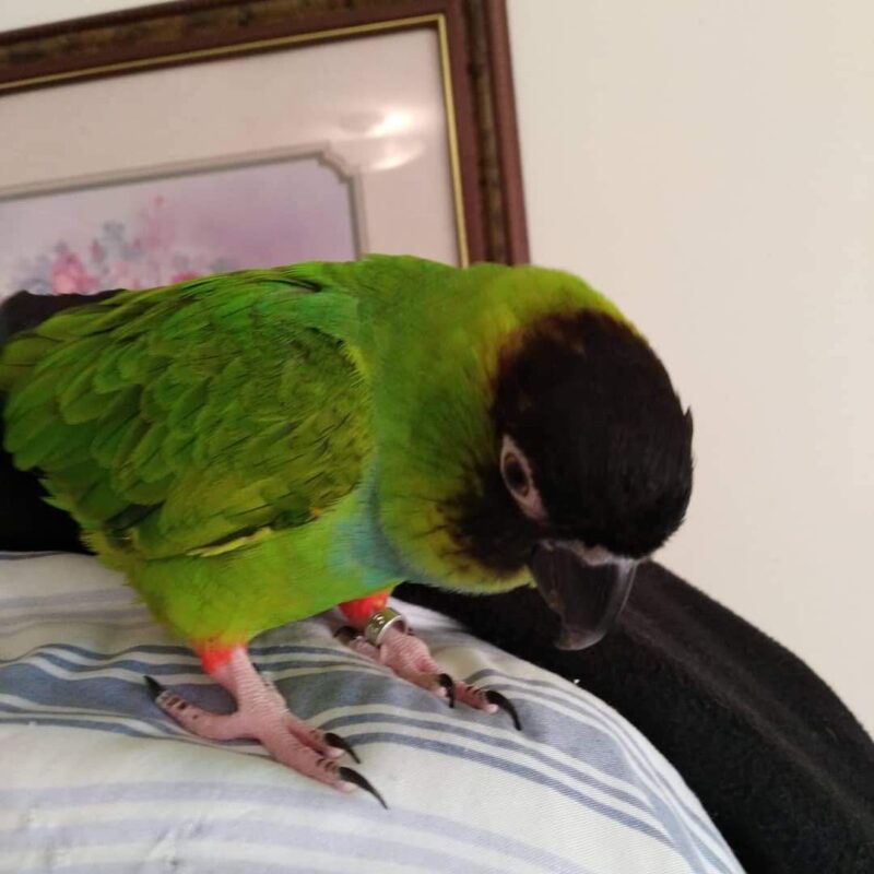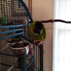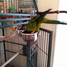 This is Shadow the Nanday conure who is still looking for a new home. As he was originally an injured found bird around a year ago we don’t know his age.